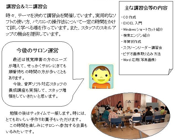主として、障害のある方や高齢の方のパソコン操作方法の取得を目的として、 パソコンに慣れ親しむためにお互いが教えたり・教えられたり、サロン形式で行います。 スタッフが側面よりサポートを行います。会員以外の方でも自由に参加出来るようにし、 パソコン未経験の方にパソコンにふれる場を提供します。2008年度には延543名の参加がありました。