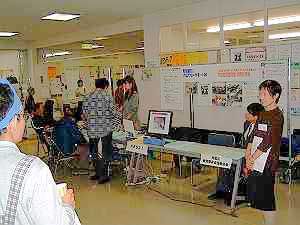 | 2003年10月18日(土)に2003ボランティアフェスティバルが午前10時より午後3時まで開催されました。 会員19名が参加して当日の運営をしました。 今回は「青葉区視覚障害者福祉協会」さんとの共催で参加しました。 まず注目は、入ってすぐ目にとまるロビーにもABS21の紹介コーナーを設けたことです。 |