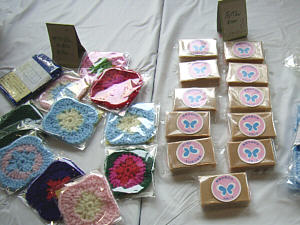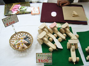 組み立てて飾れる木工製品や、縫いぐるみ、実用的なモップ、環境にやさしい石鹸、実用 的な藍染めの巾着袋などなど、昔懐かしい縁日の綿菓子の実演販売もありました。