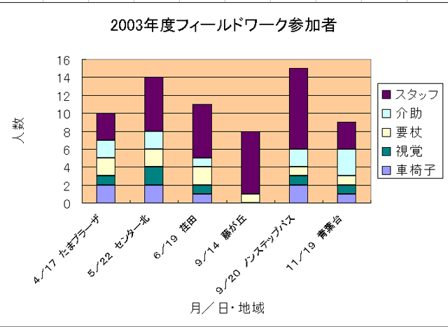 2003年度は、フィールドワークに店舗ばかりでなく、ノンステップバスの乗車体験、歴史博物館を見学するなど、メンバーの外出機会のきっかけづくりや交流の場にもなっています。